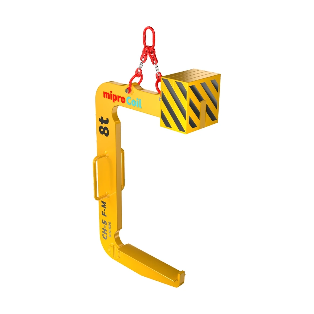 C-kavelj z zobom – polna opora omogoča nadzorovan sprejem in varen transport pločevinastih kolutov v jeklarnah, razrezovalnicah, skladiščih in logističnih objektih. Konstrukcija je zasnovana za pogoste delovne cikle z minimalno obrabo kontaktnih površin in stabilnim vodenjem bremena med dvigovanjem in nameščanjem.