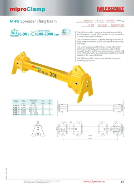 Mipromet AT-FB je robusten in vsestranski nastavljiv prečni nosilec (nosilec), prvotno zasnovan kot sestavni del sistema za pritrditev drogov AT-FS, lahko pa se uporablja tudi kot samostojno orodje za dvigovanje različnih bremen. Njegova glavna prednost je možnost natančne nastavitve delovnega območja, tj. razdalje med obešalnimi točkami.