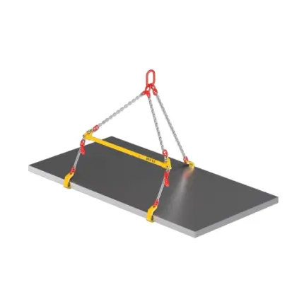 Prečne spone (3-kraka veriga) – horizontalna uporaba, optimizirana geometrija in razporeditev nosilcev za prenos pločevine in plošč v vodoravnem položaju. Zasnova omogoča varen transport, natančno namestitev in ohranjanje celovitosti površine materiala.
