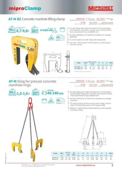 Mipromet AT-M BZ je specializirano mehansko prijemalo, zasnovano za varen in zanesljiv vertikalni transport betonskih cevi in ​​obročev jaškov. Zaradi svoje robustne konstrukcije in natančnega mehanizma je idealno orodje za vgradnjo inšpekcijskih jaškov na kanalizacijske cevovode in podobne gradbene projekte.