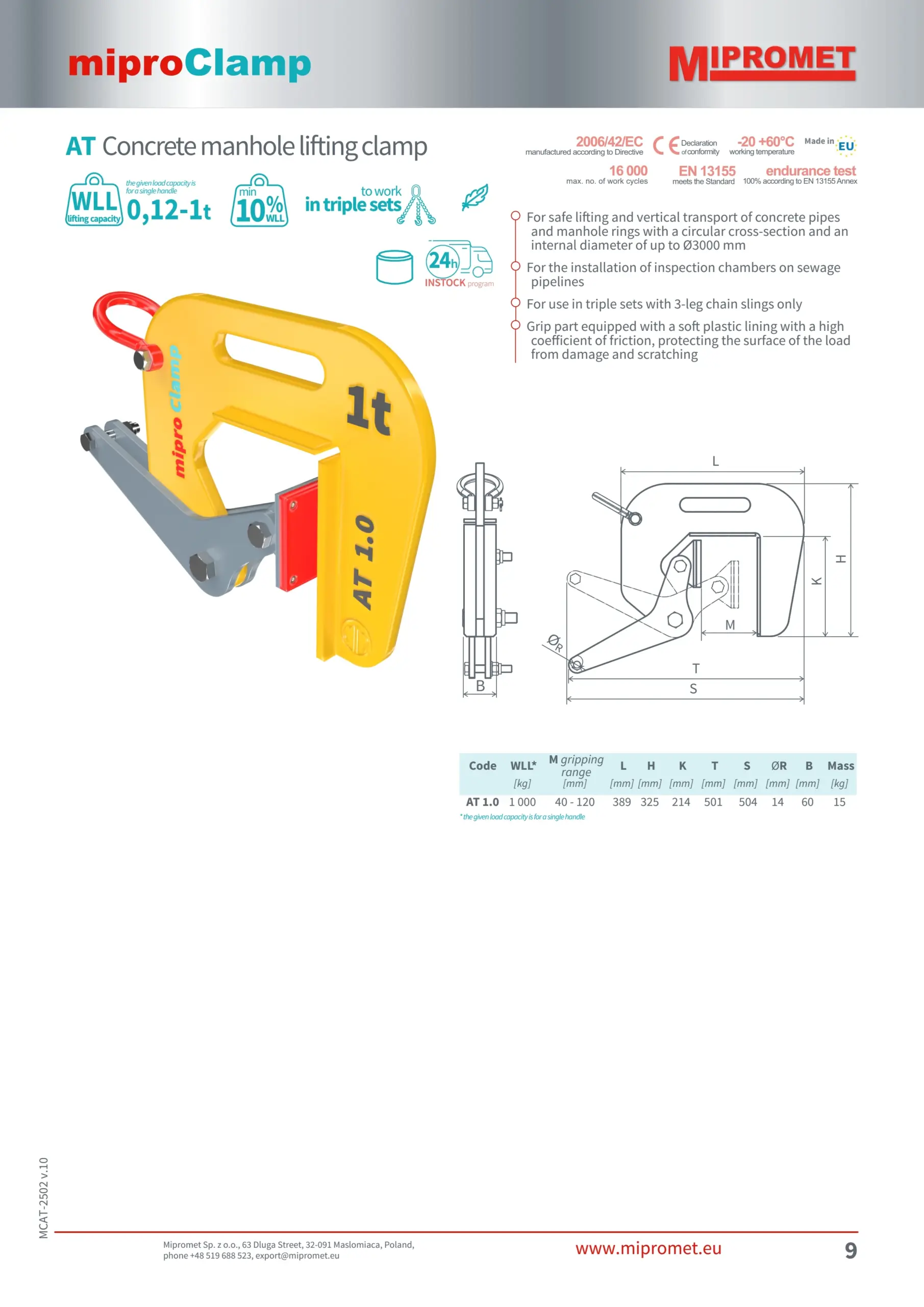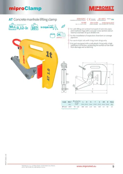 Mipromet AT 1.0 je specializirano prijemalo, zasnovano za varno dvigovanje in transport betonskih cevi in ​​obročev jaškov, kjer je bistveno preprečiti poškodbe površine. Za razliko od modelov z zobmi to prijemalo uporablja mehke plastične obloge z visokim koeficientom trenja, kar zagotavlja trden, a nežen prijem.