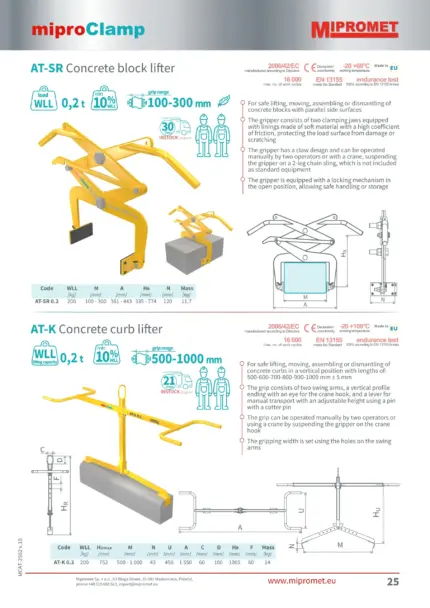 Mipromet AT-K 0.2 je specializirano prijemalo (gripper) za varno dvigovanje, premikanje in natančno postavitev betonskih robnikov v navpični položaj. Zasnovano je za delo z robniki standardnih dolžin od 500 do 1000 mm.