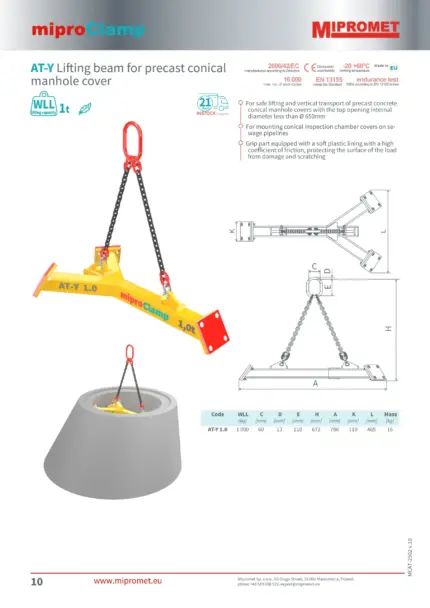 Mipromet AT-Y 1.0 je specializirana traverza (nosilec) za varno dvigovanje in vertikalni transport stožčastih pokrovov jaškov (stožcev). To orodje je natančno zasnovano za varno sprejemanje stožčastih elementov z zgornjo odprtino premera manj kot 650 mm, kar je standard v sodobni gradnji kanalizacijskih sistemov.